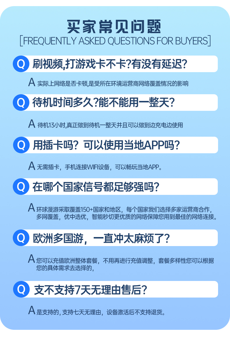 2、如产品有质量问题:自签收之日起,7天内可以联系环球漫游官方客服退换货,来回邮费均由我方承担,请在寄回前向我方客服提供货品质量问题的照片或视频,我方会对您邮寄回来的货品进行检测,若确定为质量问题,我方则为您办理退款(外包装破损但不影响货品使用的除外)