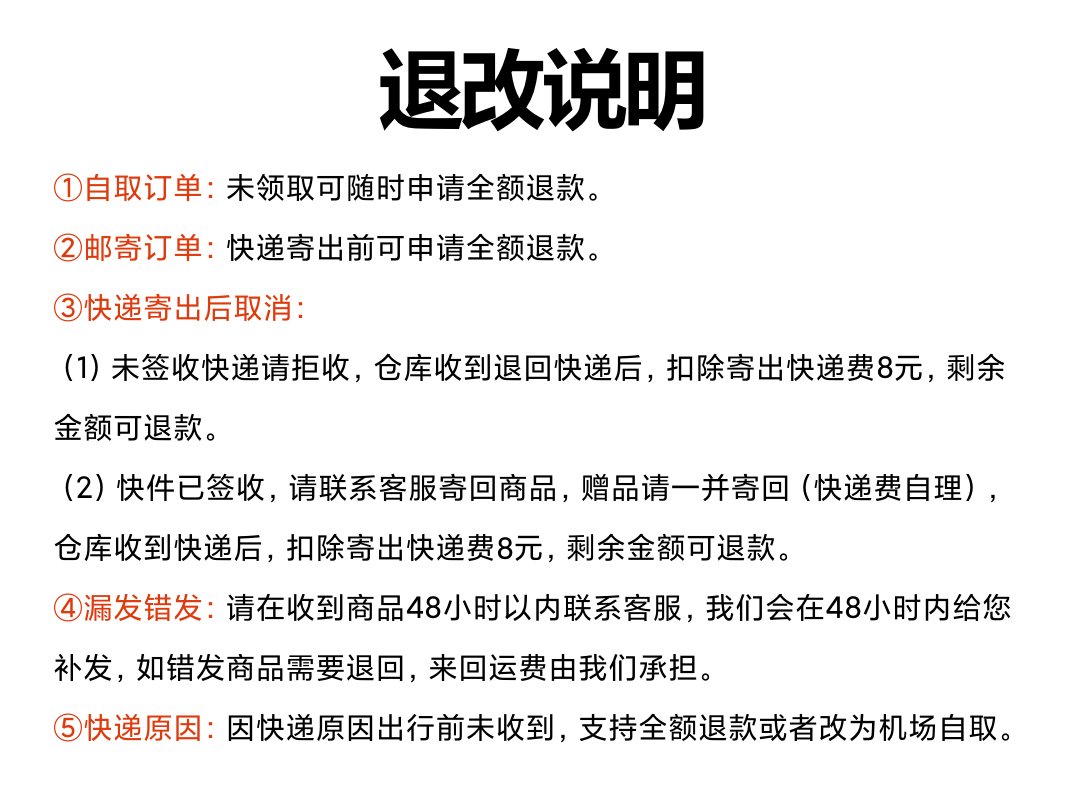 3、漏发错发:请在收到货品48小时内联系我方客服,我方会在48小时内给您补发;如错发需将货品完整退回,来回运费由我方承担。